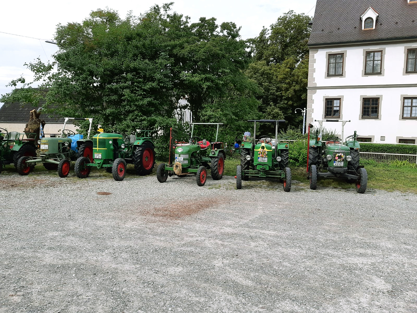 Am 15. August, lud Kissing zum Oldtimergrillfest ein. Um 9:30 Uhr ging die Fahrt ins 12 Kilometer entfernte Kissing los. Lediglich fünf Schlepper nahmen bei bewölktem und kaltem Wetter die Straße unter ihre Ackerreifen. „Gott sei Dank“ mogelten sich die fünf verwegenen Vereinsmitglieder ohne Nass zu werden zum nahe gelegenen Grillfest. Doch kaum hatte man sich niedergelassen und gegessen, begann es auch schon zu regnen und alles floh ins Bierzelt, das provisorisch mit Seitenwänden ausgestattet wurde, um die Besucher vor dem kalten Nass zu schützen. Auch die Mitglieder, die aus Richtung Königsbrunn und Augsburg nach Kissing kamen, hatten mit dem schlechten Wetter zu kämpfen. Sie hatten weniger Glück trocken zu bleiben.