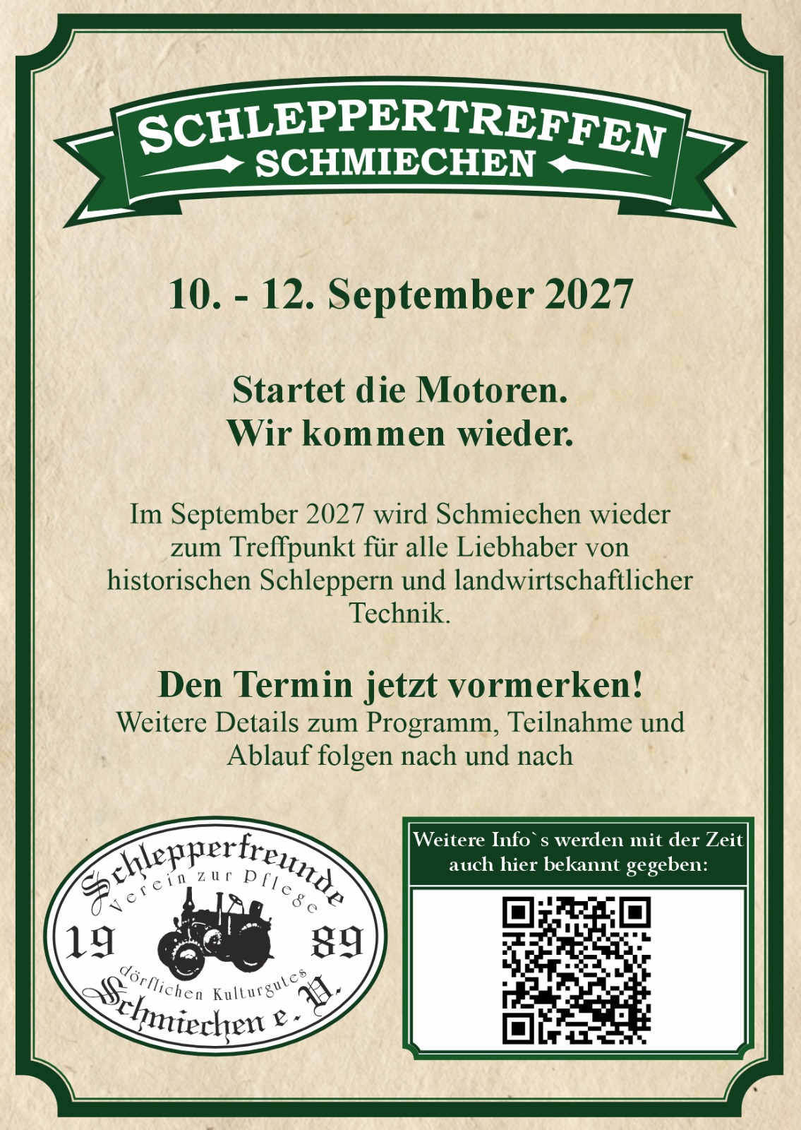 Hier werden im Laufe der Zeit sämtliche Informationen rund um unser Schleppertreffen, die wichtig sind für euch, bekannt gegeben. Also lohnt es sich, in unregelmäßigen Abständen bis hin zu unserem Treffen 2027 hier immer wieder mal reinzuschauen.